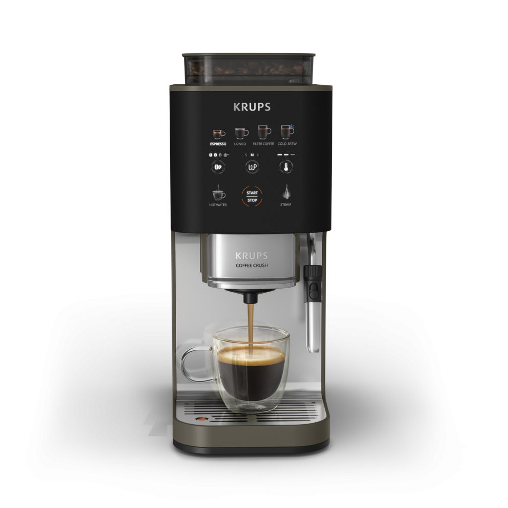 Doživite punu aromu espressa od svježe mljevene kafe jednim dodirom uz Coffee Crush Experience iz KRUPSa. Tako ukusno. Od espressa do cappuccina i hladno kuhane kafe i više, čak i s prethodno mljevenom kafom. Tako kompaktan. Širok 15 cm kako bi se savršeno uklopio u vaš interijer. Tako jednostavan. Zahvaljujući jednostavnim napicima jednim dodirom, od zrna do šoljice.